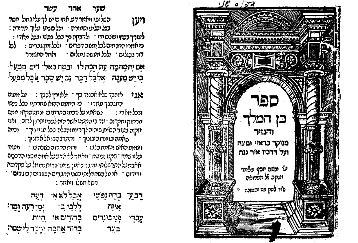 Ben ha-Melekh ve-ha-Nazir (The Prince and the Hermit) consists of tales, fables, maxims, and proverbs intermingled with prose and verse. It is a Hebrew version of a popular Hindu (Pahlavi) Indian romance that has been translated into many languages including Arabic, Georgian, Greek, and Latin. In the original Hindu version, the tale centers around a prince (Buddha) who becomes an ascetic; the protagonists are Balauhar and Budasaph. R. Abraham ben Samuel ha-Levi ibn Hasdai’s (early thirteenth century) Hebrew translation was done in the first decades of the thirteenth century. The first printing of the ibn Hasdai’s Hebrew version of the popular Ben ha-Melekh ve-ha-Nazir, however, was in Constantinople in 1518.3