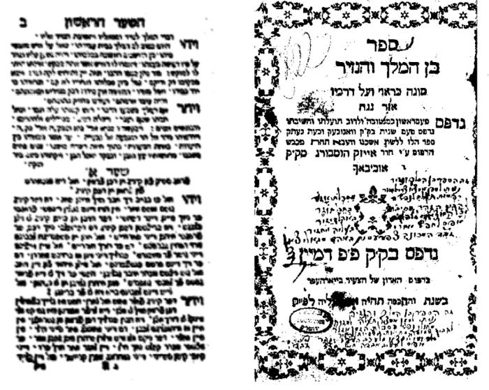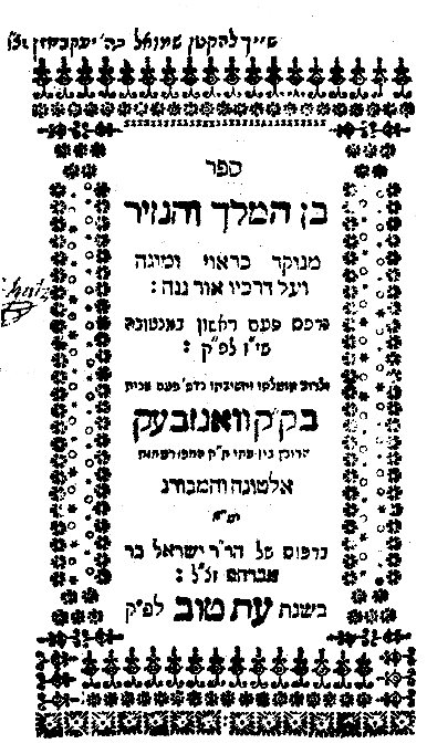 The Frankfurt on the Main issue of Ben ha-Melekh ve-ha-Nazir was printed in the year 1769, “wisdom preserves the life of him who possesses it והחכמה תחיה את בעלה (529 = 1769)” (cf. Ecclesiastes 7:12) at the press of Johann Beierhoffer in octavo format (80: 3,100, [1] [1] ff.). The title page mistakenly references the first printing as the Mantua edition and the second as the Wandsbeck edition. The text is accompanied by a translation from the Hebrew into Yiddish (Judeo-German), brought to press by R. Issac Homberg of Offenbach.