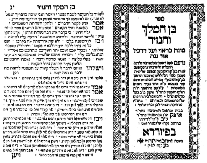 In conclusion, in this article we have described the sixteenth and eighteenth century printings of R. Abraham ben Samuel ha-Levi ibn Hasdai’s Hebrew translation of Ben ha-Melekh ve-ha-Nazir; apparently it was not published in the seventeenth century. The original Hindu (Pahlavi) Indian romance, as noted above, has been translated into many languages. Among them are Catalan, English, French, German, Russian, and Spanish. The popularity of ibn Hasdai’s Hebrew edition is attested to by the number of manuscript and printed copies recorded in the Jewish National and University Library catalogue. Forty-seven manuscript copies appear singularly or in collections of similar works; forty-six in Hebrew, dating from 1319 to 1912. Thirty-six printings of ibn Hasdai’s translation, nineteen editions of which were printed in the hundred years between 1925 and 2025, appear.